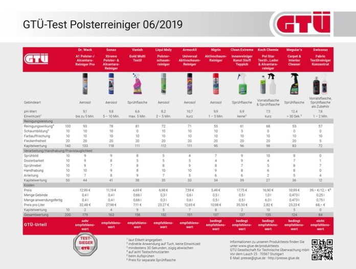 Die Sachverständigenorganisation GTÜ Gesellschaft für Technische Überwachung hat gemeinsam mit Auto Bild in einem Praxistest die Probe aufs Exempel gemacht und zehn gängige Polsterreiniger verglichen. Klarer Sieger mit dem Prädikat “sehr empfehlenswert” ist der A1 Polster-/Alcantara-Reiniger Pro von Dr. Wack (12,99 EUR), der die Schmutzarten am besten packt und sich am besten verarbeiten lässt (siehe Ergebnistabelle). Auf Platz zwei der “empfehlenswerte” Sonax Xtreme Polster- & Alcantara-Reiniger (11,19 EUR), dicht gefolgt vom Preis-/Leistungssieger Vanish Gold Multi Textil (4,69 EUR), einem Haushaltsreiniger, der wenig kostet, gründlich putzt und damit den dritten Platz in der Gesamtbewertung belegt. Auf den weiteren Plätzen die ebenfalls “empfehlenswerten” Polsterreiniger von Liqui Moly (6,98 EUR) und ArmorAll (7,59 EUR). Mit dem GTÜ-Urteil “bedingt empfehlenswert” schneiden die Schaumreiniger von Nigrin (5,49 EUR), Clean Extreme (17,75 EUR), Koch Chemie (16,90 EUR) und Meguiar’s (10,99 EUR) ab. Das teuerste Produkt im Test ist das Schlechteste, sowohl bei der Reinigungsleistung als auch bei der Anwendung: Swissvax Fabric Textilreiniger Konzentrat ist mit 39 Euro extrem teuer und landet somit “nicht empfehlenswert” auf dem letzten Platz.